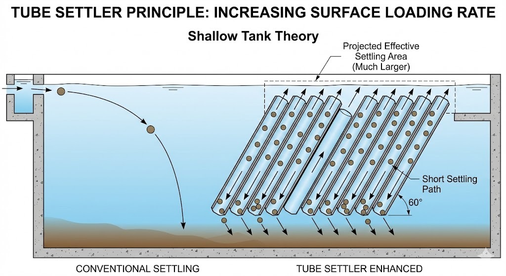Required Area = Design Flow Rate / Allowable Overflow Rate. Typically, tube settlers allow for overflow rates 2 to 4 times higher than conventional clarifiers without tubes, effectively doubling or tripling the capacity of an existing tank.