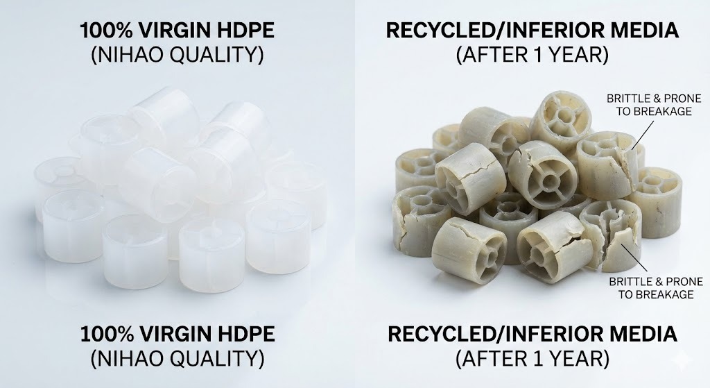 100% Virgin HDPE (High-Density Polyethylene) is preferred because it offers superior mechanical strength, chemical resistance, and the correct density (0.95-0.97 g/cm3) for fluidization. Recycled materials often contain impurities that make the media brittle or cause it to sink, leading to system failure within 2-3 years.