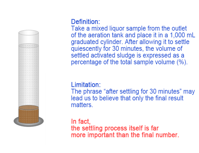 | Settling Speed | Initial flocculation speed and the rate of free and flocculent settling; speed at which the sludge-water interface forms. | 1. Activated sludge activity (higher = faster); 2. Sludge aging (older = slower); 3. Sludge toxicity (toxic = slower); 4. Sludge viscosity (higher = slower); 5. Filamentous bulking (overall slower); 6. Sludge concentration (early flocculent settling); 7. Suspended solids content (higher = slower); 8. Water temperature and viscosity. |