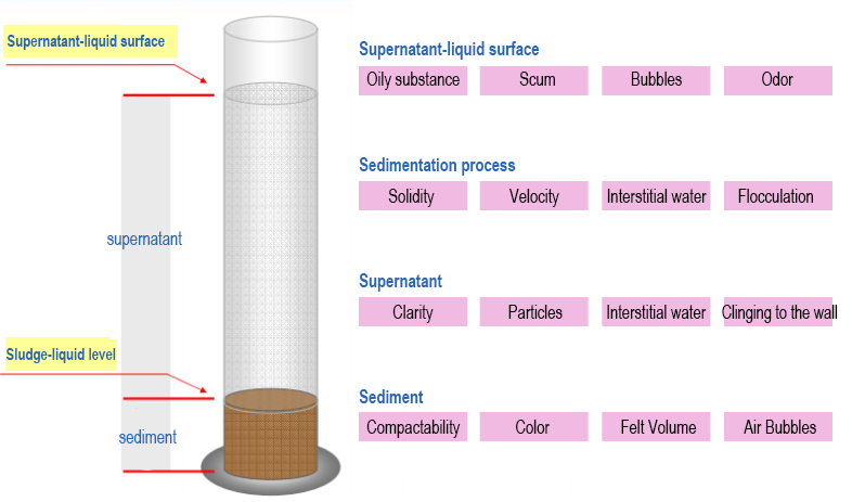 | Supernatant surface — Odor | Odor emitted (during initial settling) | 1. Strong earthy (musty) odor indicates high biological activity 2. Strong acidic or alkaline smell indicates abnormal mixed liquor pH 3. Strong foul odor suggests oxygen deficiency 4. Other unusual odors may indicate inflow of specific industrial wastewater. |