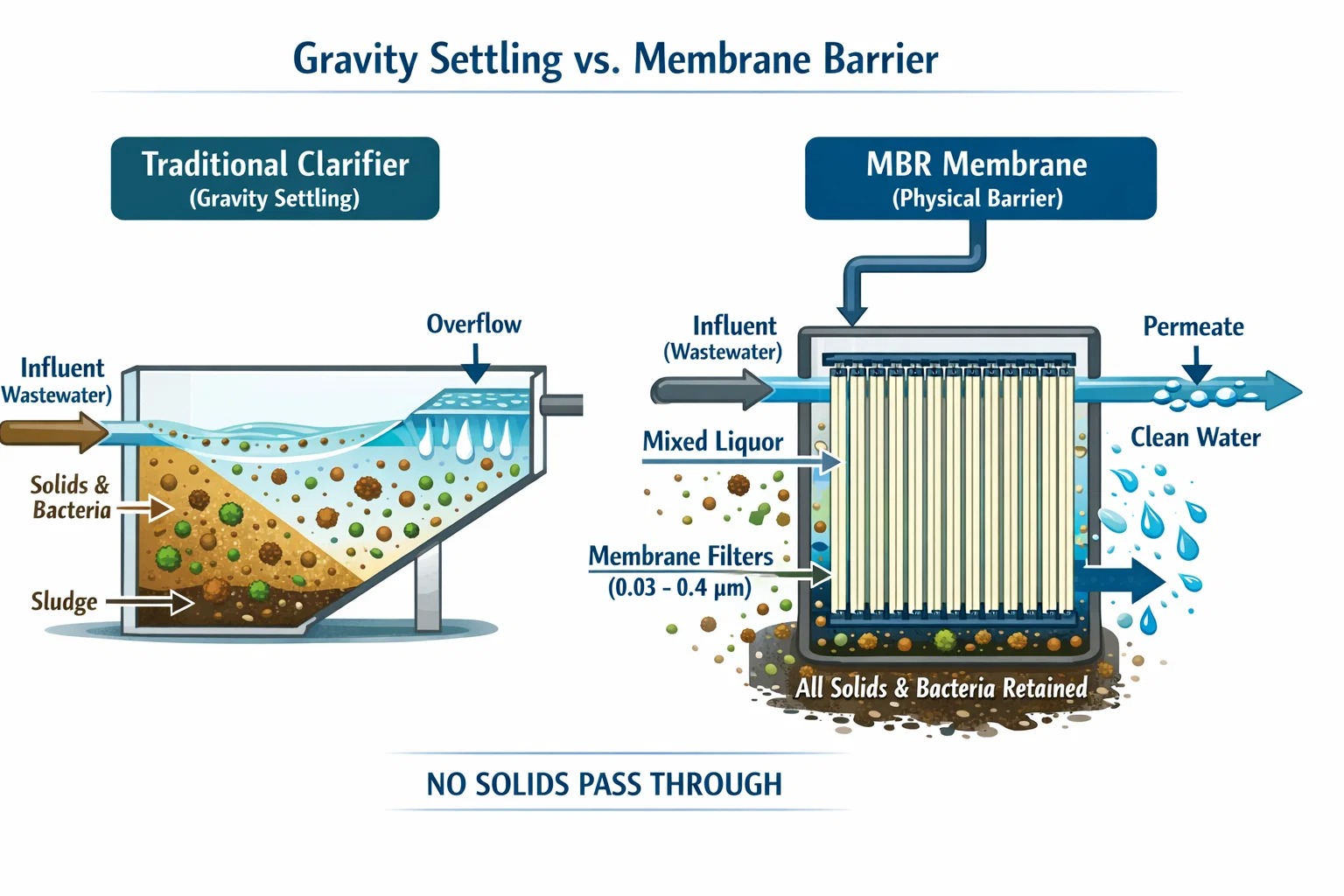 In a conventional plant, you are limited by how fast a particle can sink. In an MBR, we use a physical membrane barrier (typically 0.03 to 0.4 μm).